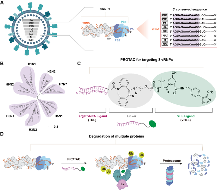 南开大学化学学院研究员刘书琳团队近日成功开辟出一条广谱抗甲流新路径,该策略通过同步降解病毒复制核心的多个关键组件,从根本上瓦解病毒的进化优势,为开发下一代强效、持久且广谱的抗流感药物奠定了坚实基础。相关研究成果近期在国际学术期刊《美国化学会志》上发表。