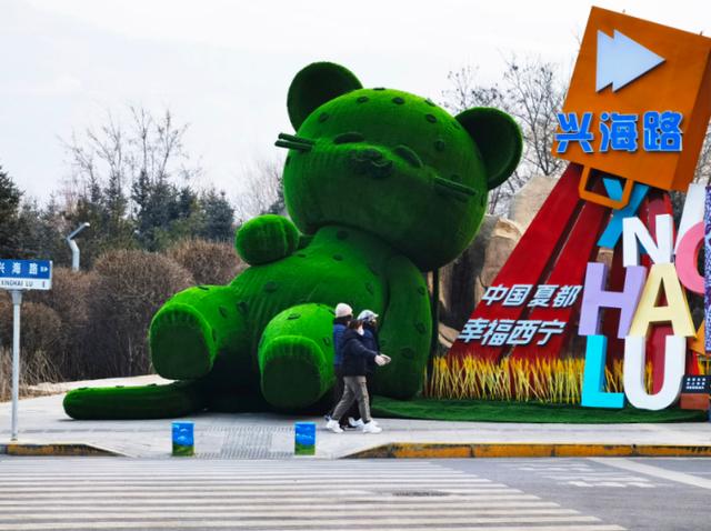 1月4日,西宁兴海路街头,一只六七米高的雪豹玩偶“半躺”路边,引得行人纷纷驻足。沿街部分老字号餐饮店外墙还设置了美食模型,十分吸睛。为培育特色文旅商业街区,西宁市城西区相关部门持续发力,兴海路面貌焕然一新。