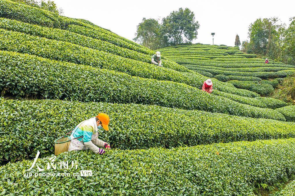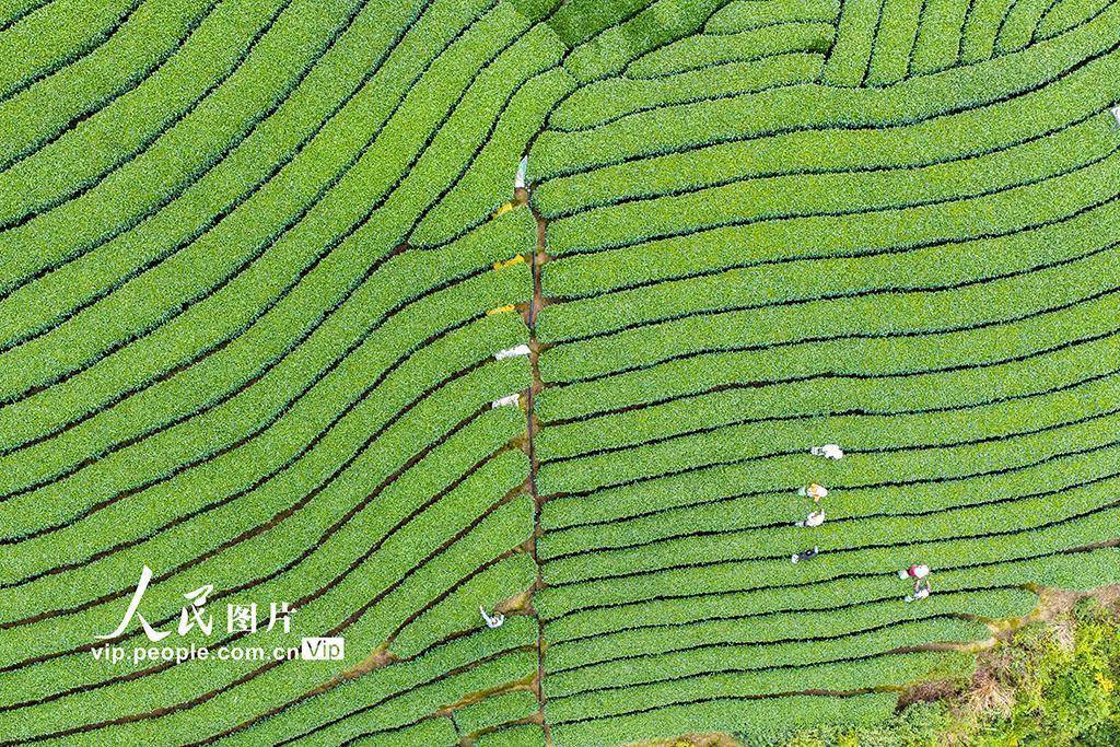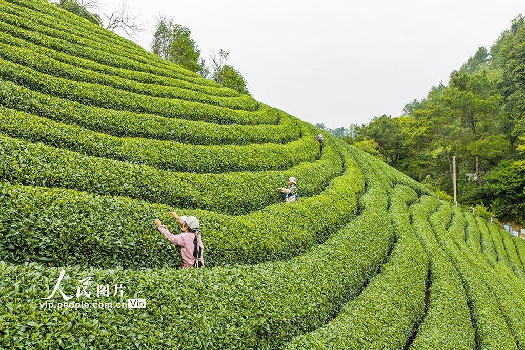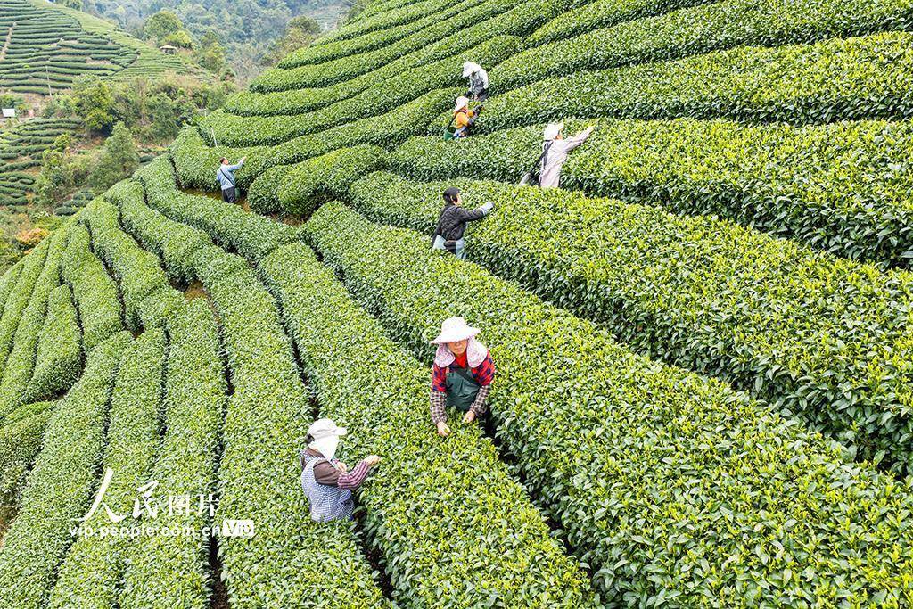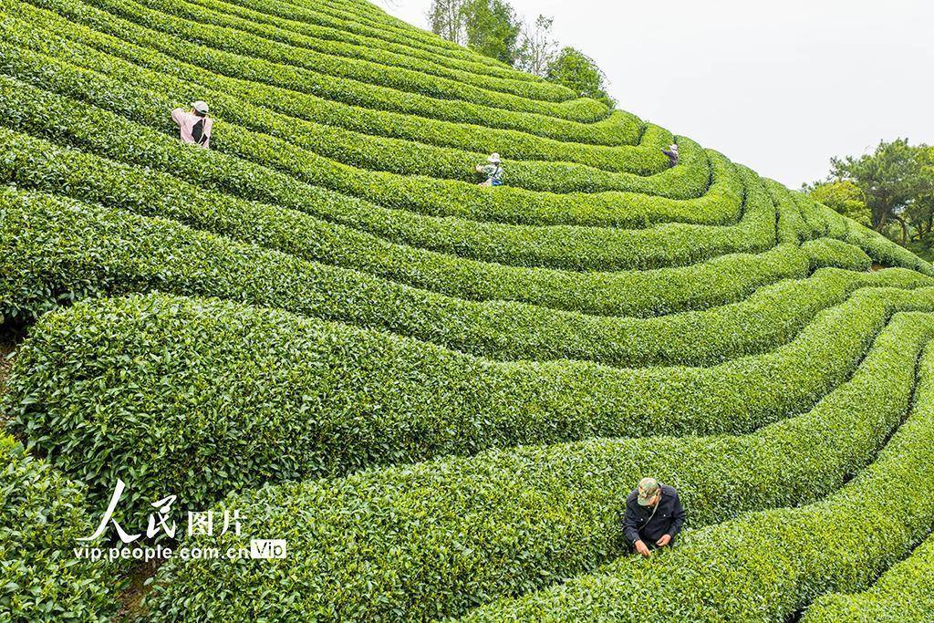 眼下,昭平县春茶已全面进入采摘期,茶农们早出晚归,加紧采收,山间茶园一派繁忙景象。黄胜林摄(人民图片网)