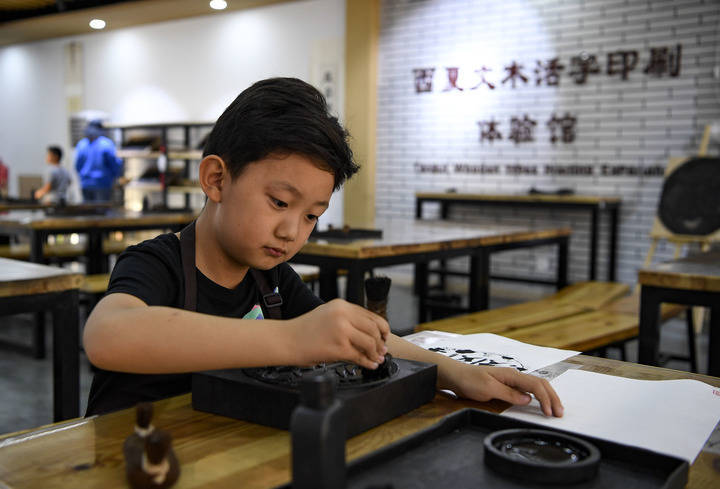 一名小朋友在宁夏银川市西夏陵景区体验西夏文木活字印刷。这些年,西夏遗址考古捷报频传:出土于武威的西夏文《维摩诘所说经》下卷,被认定为迄今世界上发现最早的泥活字印本;出土于银川的《吉祥遍至口和本续》,则是已知世界范围内最早的木活字印本。专家甚至考证出,活字印刷在这一时期已被用于制作格式统一、填写便捷的粮草税收文书,展现了其超越宗教传播的实用价值。